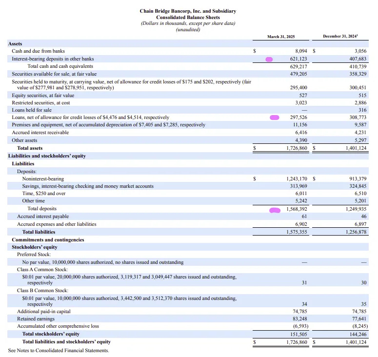 Chain Bridge also has an industry low Loan-to-Deposit ratio of just 18% ($297 Million in Loans, Total Deposits of $1.568 Billion).