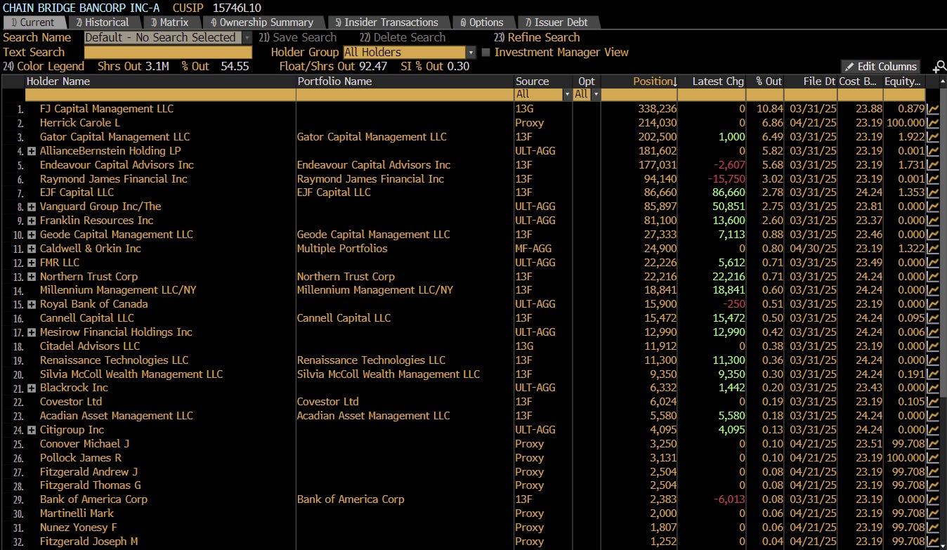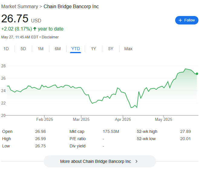 The election is now in the rear-view mirror, and Chain Bridge’s Q4 2024 and Q1 2025 results have demonstrated its operating leverage and high potential for growth. Shares have since recovered from the $22 April “Liberation Day” Lows to $26.63, and I think people are beginning to realize something the more they look at Chain Bridge: It’s a business that shouldn’t be valued like a typical bank.