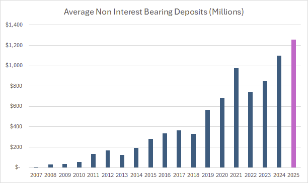 Chain Bridge’s unique pursuit of Republican PAC money has been wildly successful. Chain Bridge’s Breakthrough moment came after it landed Trump’s 2016 Presidential Campaign as a client, and growth has since accelerated as heavy-hitting PACs such as Save America, the Trump Joint Finance Committee, and Congressional Leadership Campaigns continue to shift banking relationships over to Chain Bridge. Growth in the client base and overall political fundraising has propelled average political-related deposits to a record $1.15 Billion in 2024, a gargantuan amount relative to Chain Bridge’s humble $30 Million start in 2008.
