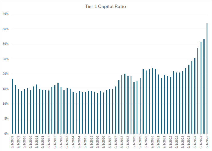 As shown below, Chain Bridge has an industry leading Tier 1 Capital Ratio of 43%, which continues to improve as Chain Bridge’s small municipal securities portfolio rolls off and becomes cash.