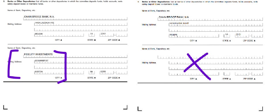 It’s impossible to predict exactly where the quarter-end Political-Related deposits figure ends up for Q2. My initial concern with the sizeable outflows was that it represented customers leaving the bank, but I have confirmed that is not the case. Additionally, if anything, FEC Filings indicate that more and more Trump-affiliated PACs are in fact consolidating their banking business at Chain Bridge. Below is a comparison of Trump’s latest PAC, the Trump 47 Committee, removing Fidelity as a bank in its January 2025 Filing relative to its August 2024 filing.