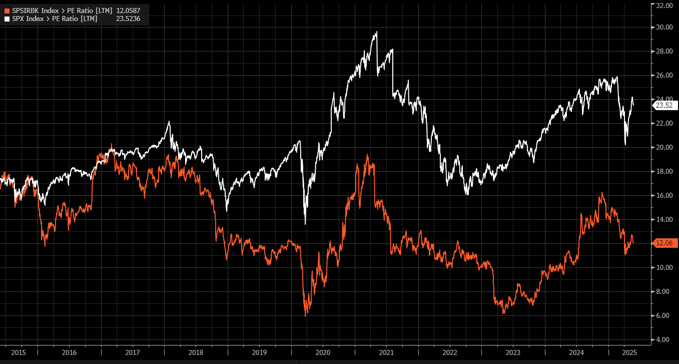 This really deserves a longer discussion, but a good question to ask before considering any bank as an investment is “Why do regional banks trade consistently trade a significantly lower multiple than the S&P 500?”