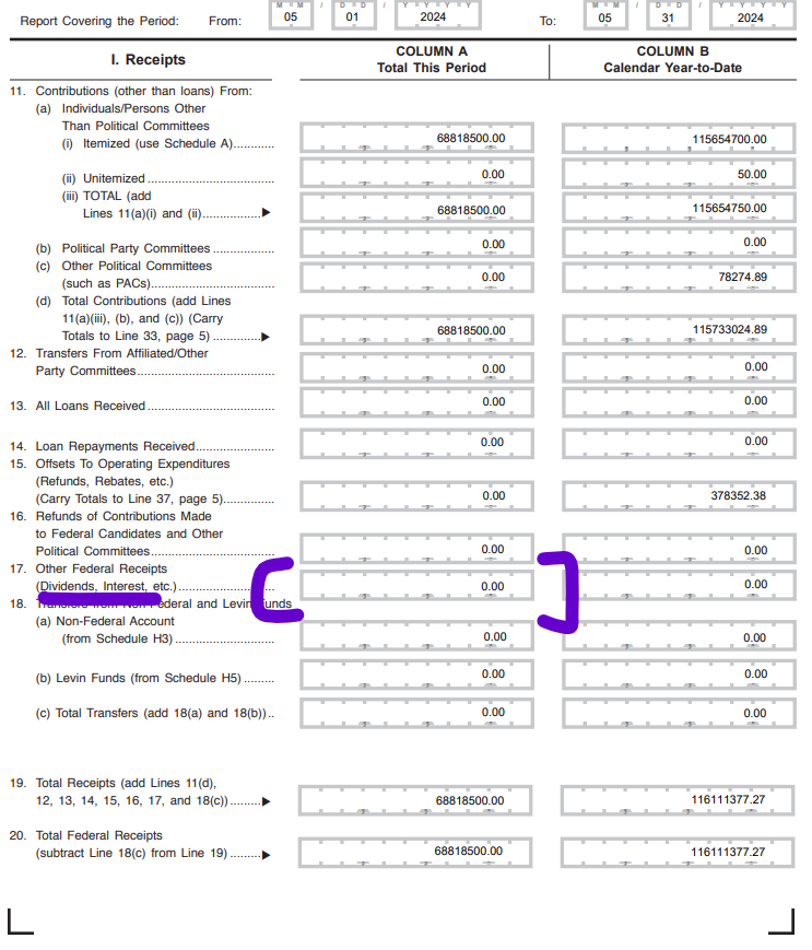 I also considered the possibility the funds were invested into T-Bills. While this is a possibility, I’d be surprised if it accounted for the entire outflow as Trump-related organizations, and PACs in general, do not do this. Throughout 2024 PACs such as Make American Great Again Inc, which held sizeable cash balances of more than $500 Million, reported nothing in dividend and interest income.
