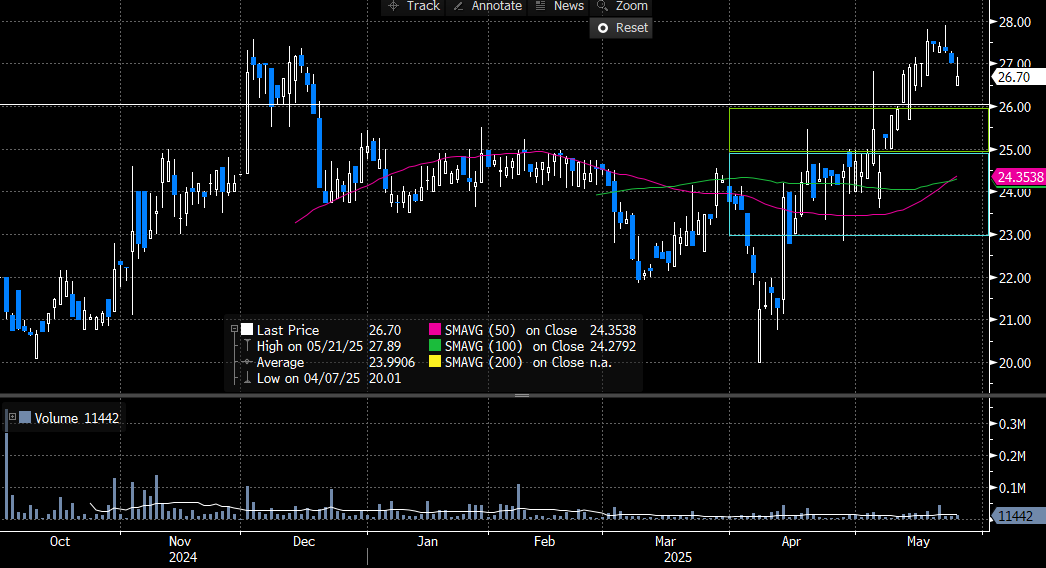 At $26.63 Chain Bridge benefits from obvious tailwinds such as the Russell 2000 reconstitution tailwind and a sub-industry multiple despite its strong growth and minimal balance sheet risk, but it has also run up approximately 9% in the last 20 sessions which lessens the risk-to-reward relative to where it was at the beginning of May. To take advantage of this, I’ve left outstanding GTC orders to add to my position in the $25 - $26 range, which represents a lower 8-12% Premium to Tangible Book.